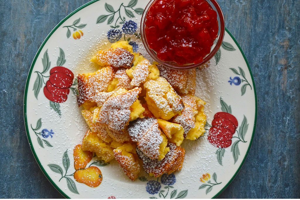 As you can see from the above photo, this is not a pancake as we know it! Kaiserschmarrn is torn up into pieces and tossed in icing sugar. It's often served with an apple or plum compote, but it's equally delicious just on its own or with some fresh fruit.